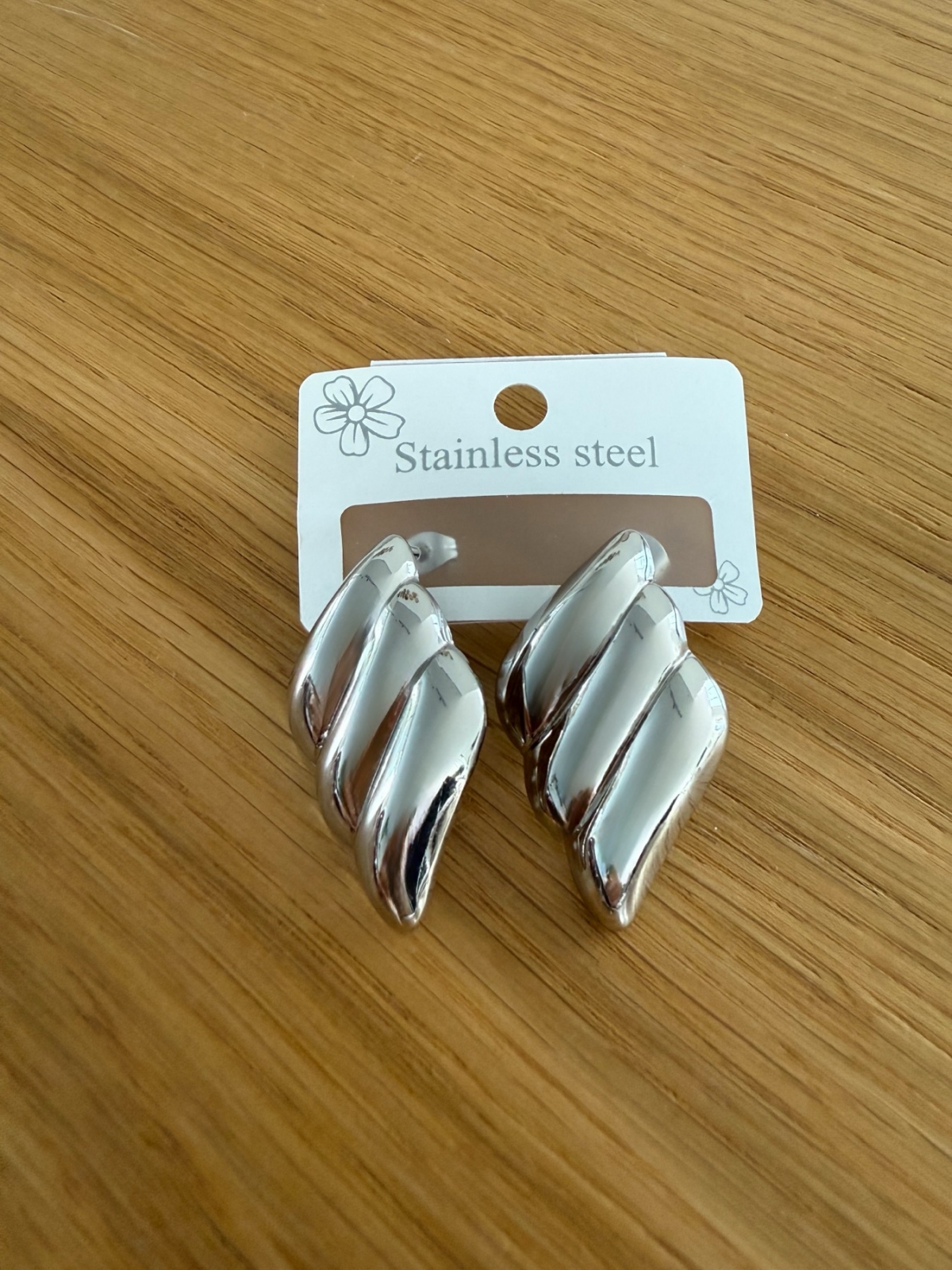 Ασημί σκουλαρίκια από stainless steel με κυματιστό design και γυαλιστερό φινίρισμα.