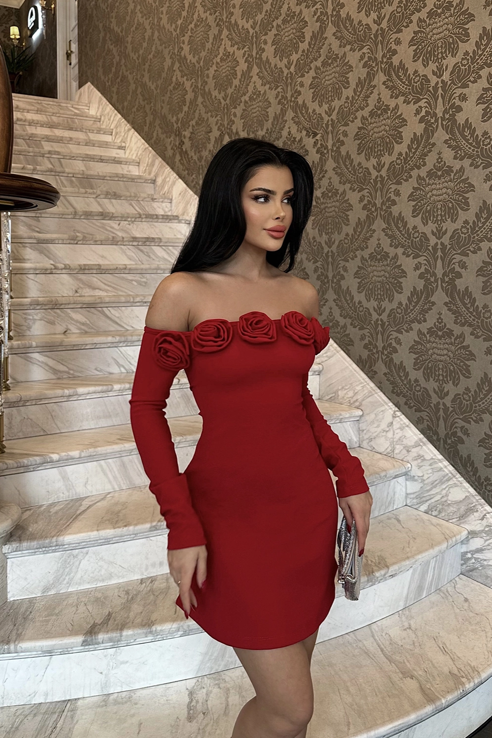 Η off-shoulder γραμμή και οι ροζέτες στο μπούστο προσφέρουν ρομαντικό αλλά ταυτόχρονα εντυπωσιακό look, ενώ η εφαρμογή αγκαλιάζει το σώμα με κομψότητα.