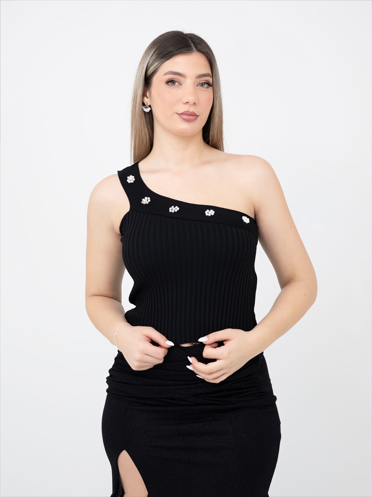 ΠΛΕΚΤΟ ΜΠΛΟΥΖΑΚΙ ΕΝΑΣ ΩΜΟΣ ΜΕ ΠΕΡΛΕΣ ΛΟΥΛΟΥΔΙΑ - ΜΑΥΡΟ